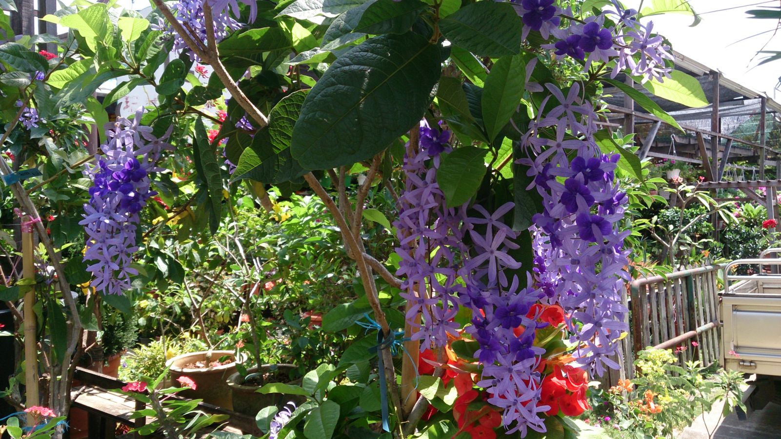 Nggak ada yang lebih asri dibanding halaman depan rumah yang digelantungi tanaman rambat berbunga menawan ini